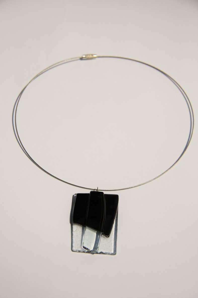 Črna ogrlica je unikatno oblikovana in izdelana iz taljenega stekla. Steklen nakit je, ne glede na svojo krhko vhodno surovino, trden, predvsem pa čudovitega sijaja. Kovinski deli nakita so brez niklja.