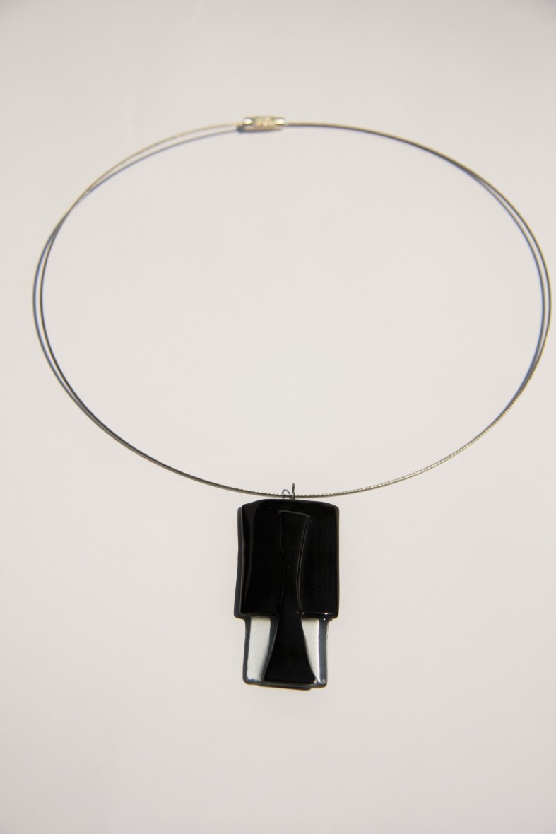 Črna ogrlica je unikatno oblikovana in izdelana iz taljenega stekla. Steklen nakit je, ne glede na svojo krhko vhodno surovino, trden, predvsem pa čudovitega sijaja. Kovinski deli nakita so brez niklja.