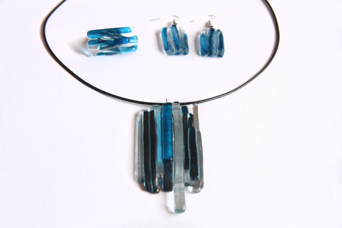 Modra ogrlica je unikatno oblikovana in izdelana iz taljenega stekla. Steklen nakit je, ne glede na svojo krhko vhodno surovino, trden, predvsem pa čudovitega sijaja. Kovinski deli nakita so brez niklja.